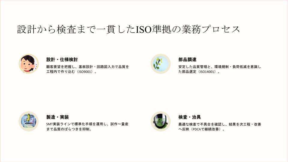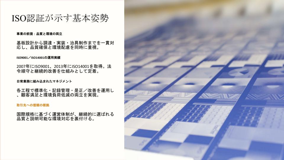 ISOといえばネジやフィルムなどの規格として一般的ですが、組織運営の仕組みの国際規格であるISO9001(品質マネジメントシステム)、ISO14001(環境マネジメントシステム)、ISO22000(食品安全マネジメントシステム)などもすでに多数の企業が取得しております。